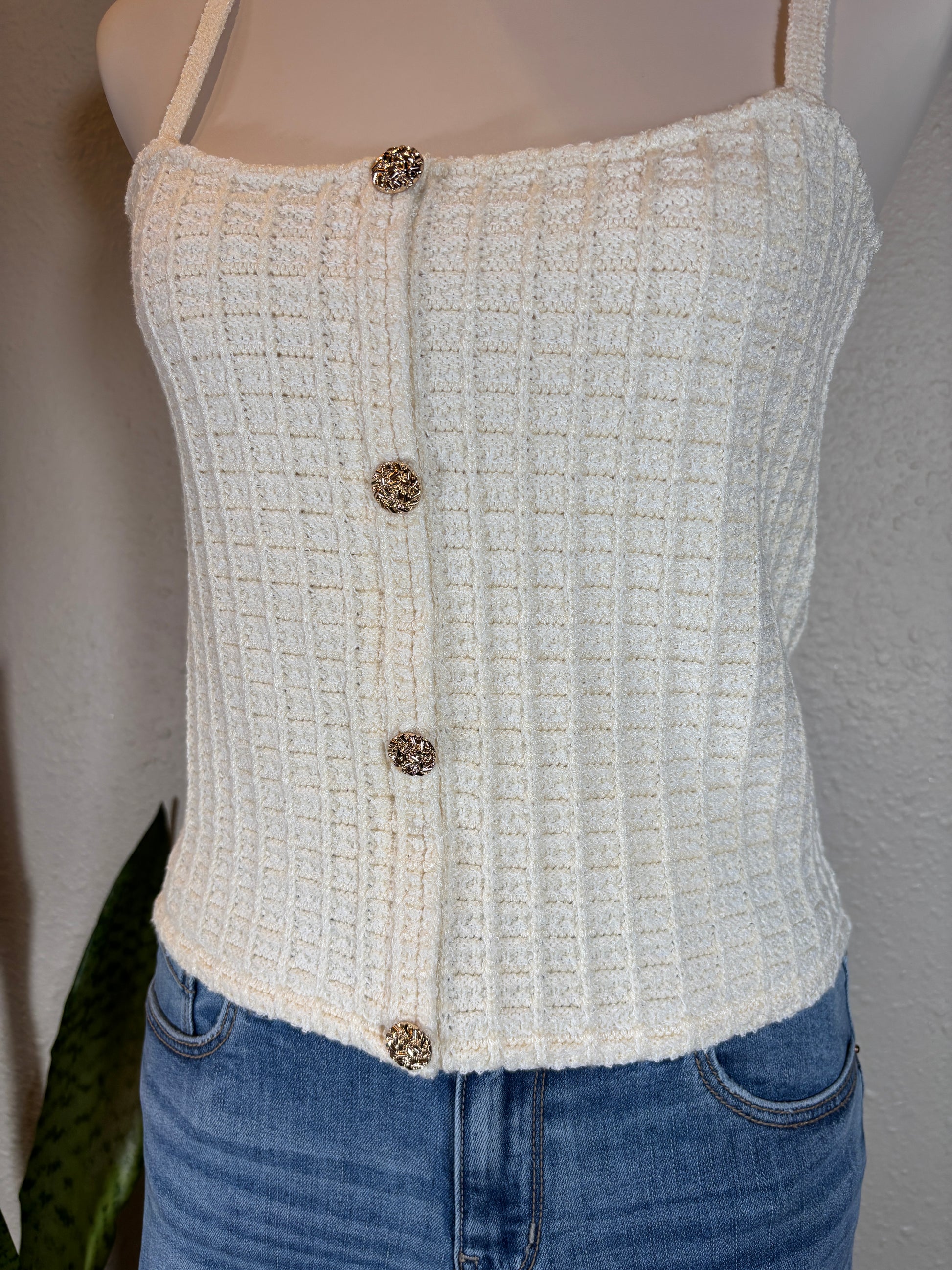 Effortless elegance meets everyday comfort in this button-front knit cami. The natural tone pairs with everything in your closet, while the soft knit fabric drapes beautifully against your skin. Perfect as a standalone piece or layered under your favorite jacket, this versatile cami brings a touch of laid-back sophistication to any outfit. Simple, chic, and oh-so-wearable.