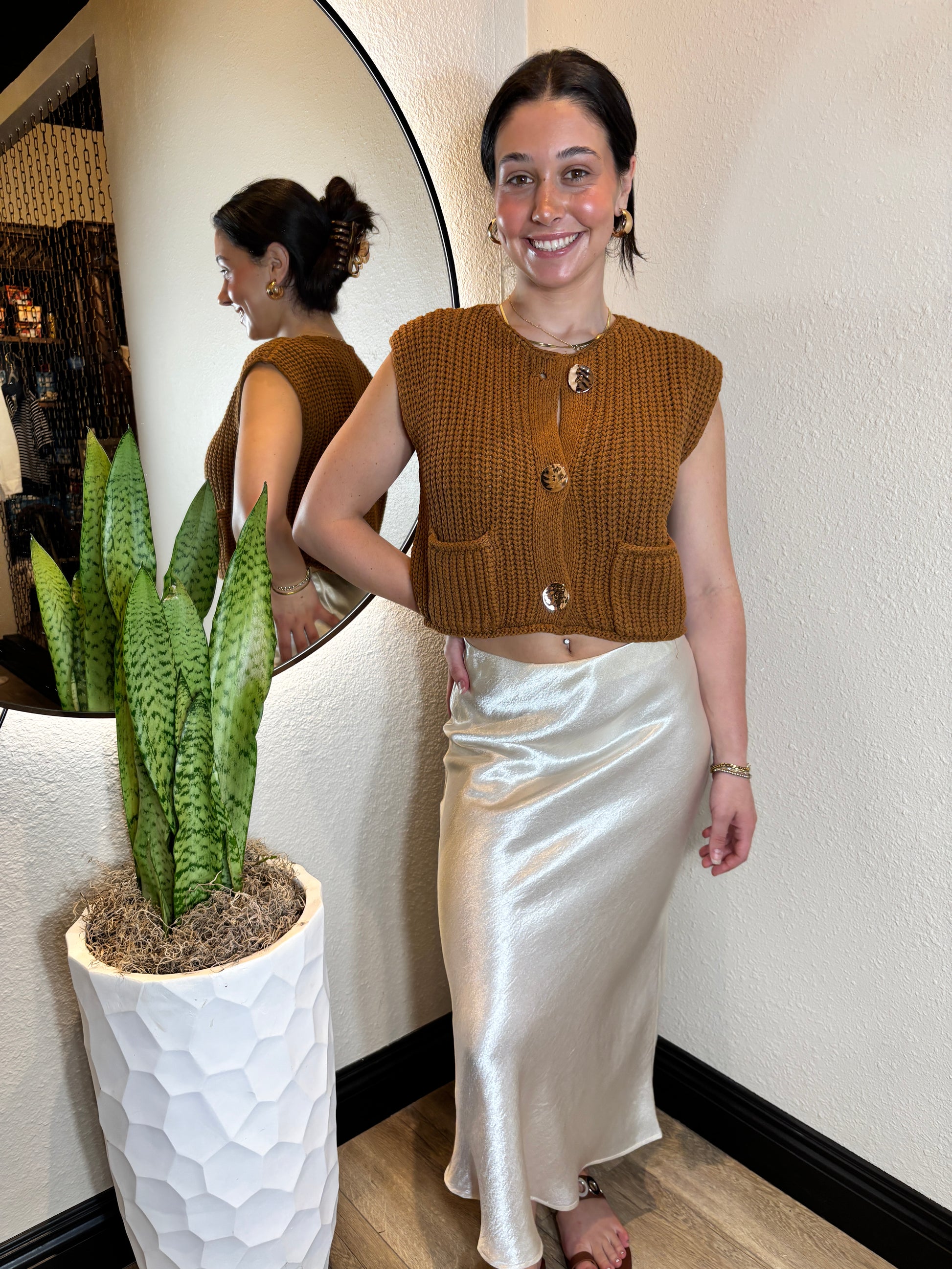 Layer up with cozy vibes in this chunky crochet knit vest! Perfect for adding texture and warmth to any outfit, this caramel-toned piece brings that handmade charm and effortless style. Whether you're pairing it over a tee or a long-sleeve, this vest is your go-to for casual comfort that doesn't compromise on looks. Snuggle into softness and make a statement with every wear.
