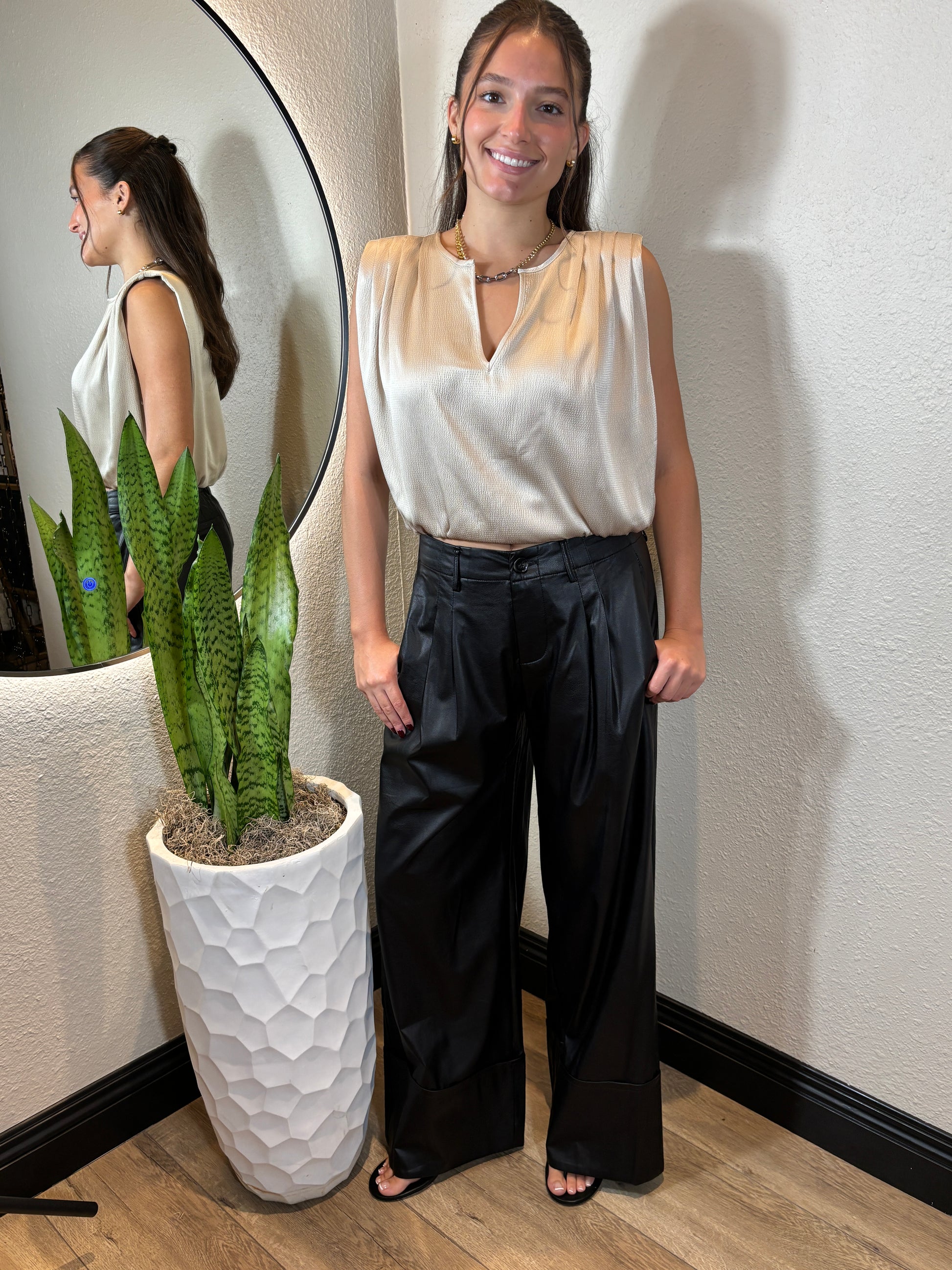 Add a touch of edge to your wardrobe with these faux leather pants. The wide leg design features pleats and a wide fake cuff for an elevated look. The elastic waist and attached front pockets add comfort and convenience. With a playful and rebellious vibe, these pants are perfect for the fashion-forward individual.
